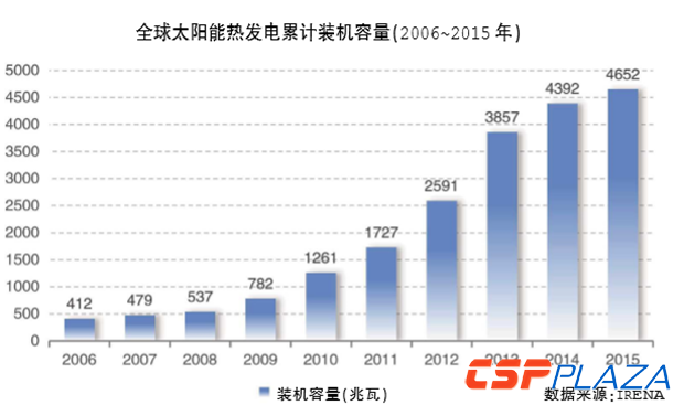 圖:全球太陽能熱發電累計裝機容量(2006~2015年)