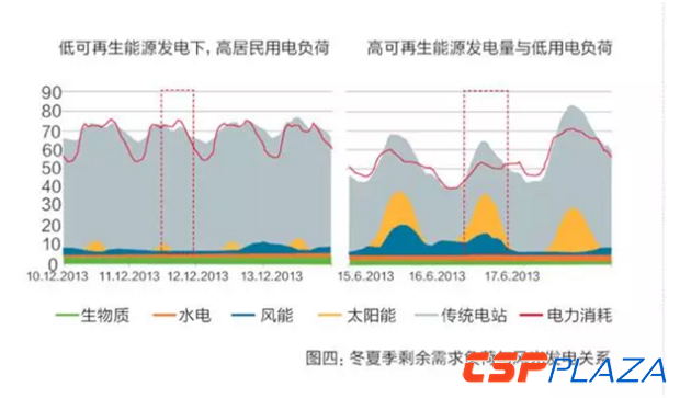 由于政策已制訂了未來可再生能源發電高比例增長的目標,而目前市場上低邊際成本的風電光伏又能優先并網發電,剩余需求負荷(residualload)于是成為影響電力市場設計的一個重要概念。它指除去風光發電外、剩余發電組合所需承擔的電力需求量。圖四分別給出了冬夏季可再生能源發電量與剩余需求負荷間的普遍關系,夏季風光發電多,需求總量較小,剩余需求負荷小;冬季反之。未來還可能出現兩種極端情況:1.最大剩余需求負荷:用電需求高,同時幾乎不產生風能和太陽能,這可能發生在一個寒冷無風的冬夜;2.最小剩余需求負荷:電力需求低,但同時產生大量風能和太陽能發電,這可能發生在有風和/或陽光明媚的周末或節假日。