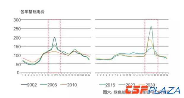 在傳統能源結構下,用電高峰使峰值電價總是出現在每日10:00到14:00點之間,可達日平均電價的1.2至2倍。隨著越來越多風能與太陽能的投入,傳統化石能源逐漸退出發電市場,電價波動更為頻繁劇烈。模擬結果顯示,午間時段10:00到14:00間的用電高峰恰也是未來太陽能發電高峰,隨著光伏的規模不斷擴大,中午的電力供需矛盾將明顯緩解,這一時段的峰值電價曲線趨于平緩。傍晚時分太陽能發電大幅減弱直至為零,此時生活用能趨高,而傳統化石能源發電規模已經削減,傍晚將出現全天的峰值電價。日內電價峰值將由過去的雙峰變為未來的單峰。到2030年日峰值電價最多可達平均電價的2.5倍以上,同時夜間01:00到06:00點的谷期電價也有抬升:2002和2006年的最低谷期電價僅為日平均電價的二分之一,而從2015年起這一數字將提高到0.7左右。這樣的價格信息反映了綠色能源結構對未來電力市場的影響。縱向相比圖右2023年傍晚的峰谷價與日平均電價相比分別為2.6與0.7,大約是4倍。而到2030年,峰谷價差明顯縮小,這恰是2.0市場、需求側管理、儲能等多項因素發揮作用的結果。