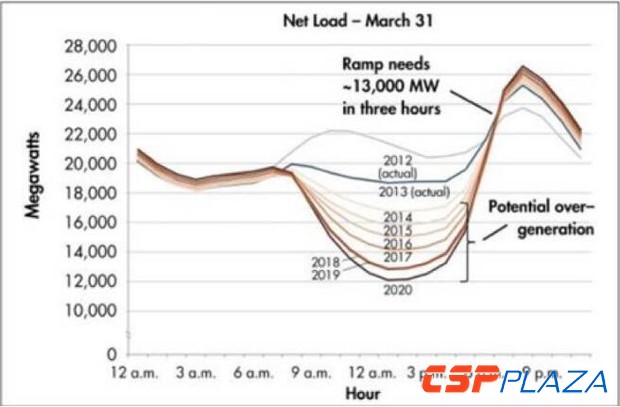 圖:上圖的“鴨子曲線”可以形象的表示出加州一天24小時中的電力凈負荷情況