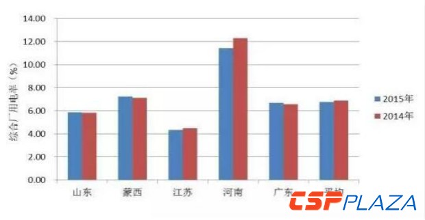 從山東、蒙西、江蘇、河南、廣東五個重點省份(重點省份選取該類型機組發電量排序前5名省份,下同。)看,2015年平均綜合廠用電率為6.76%,同比下降1.72%。其中河南最高,為11.41%,江蘇最低,為4.34%。詳見下圖。