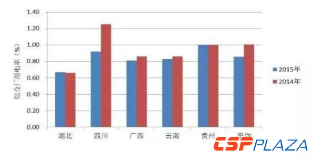 從四川、湖北、云南、貴州、廣西五個重點省份看,2015年平均綜合廠用電率為0.86%,同比下降14.80%。其中貴州最高,為1%,湖北最低,為0.67%。詳見下圖。