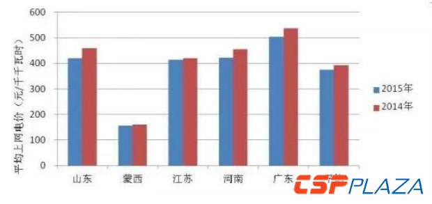 從山東(dong)、蒙西、江蘇、河南、廣東(dong)五(wu)個重點省(sheng)份看,2015年平均上網(wang)電價為376.02元(yuan)/千千瓦時(shi),同比(bi)下降(jiang)4.34%。其中廣東(dong)最高,為504.76元(yuan)/千千瓦時(shi),蒙西最低,為157.32元(yuan)/千千瓦時(shi)。詳見下圖