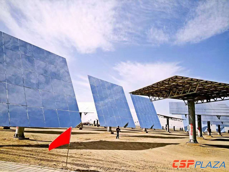 該10MW熔鹽塔電站的太陽島總計安裝1500多臺定日鏡,單臺定日鏡采光面積115.5平方米,總采光面積約18萬平方米,集熱塔高約130米。配置15小時儲熱系統,總熔鹽用量達5800噸,化鹽工作于10月17日已經完成,系統此后至今開始重點進行熔鹽傳儲熱系統的調試。