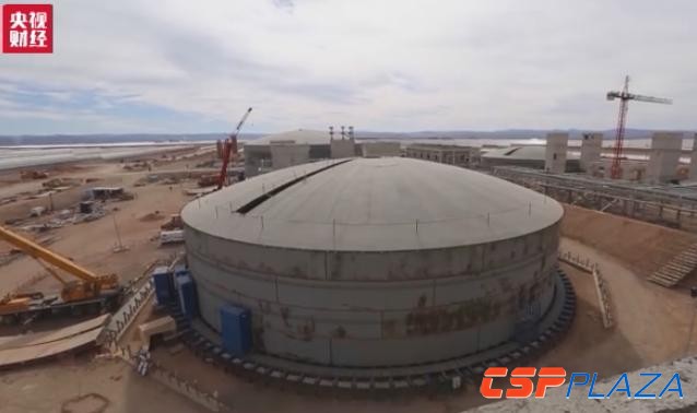 記者平凡:這里就是光熱項目的動力島,也是整個項目的心臟,所有被吸收的熱能都會集中到這里,轉化成電能,部分熱量也會被儲存到這樣的儲能罐里,在晚間進行發電,這也使得光熱項目的發電小時數每天能達到17個小時,遠遠超過了普通的光伏項目。