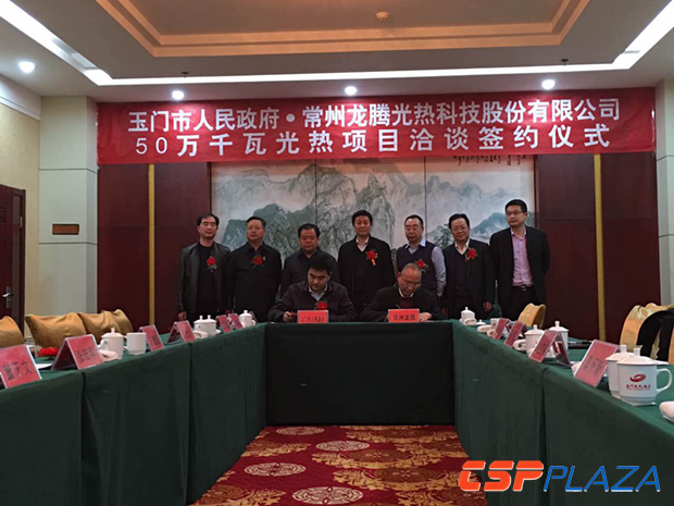 11月22日,常州龍騰光熱科技股份有限公司與玉門市人民政府簽訂了50萬千瓦光熱發電項目協議,雙方將借助玉門市優質的太陽能資源和良好的投資環境以及常州龍騰在光熱發電領域的優勢地位,在玉門市建設總計為50萬千瓦的光熱發電項目。龍騰本次入選國家示范的5萬千瓦項目即為本框架內第一期項目。