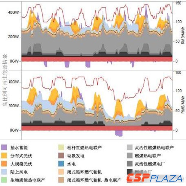 圖:高比(bi)例可再生能源情景(jing)下燃煤電廠在2020年(nian)第12周(上部(bu))和第38周(底(di)部(bu))的(de)靈(ling)活(huo)運營