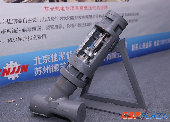 A1展位的北京佳潔能新節能技術有限公司主要生產高溫熔鹽閥,在中海陽熔鹽儲能試驗項目中已有供貨,該熔鹽閥采用一體式鍛造閥體,承壓部件設置于閥腔內,沒有閥體閥帽墊片或壓力密封件,采用進口合金鋼波紋管,具有自清潔作用,確保高溫密封盒使用壽命。同時,該公司還設計了針對光熱發電頻繁啟停特點的汽輪機高低壓旁路閥及控制系統,系統零泄漏,適應頻繁起停,價格還不到進口的一半,該旁路系統現已應用于國內某光熱項目中。