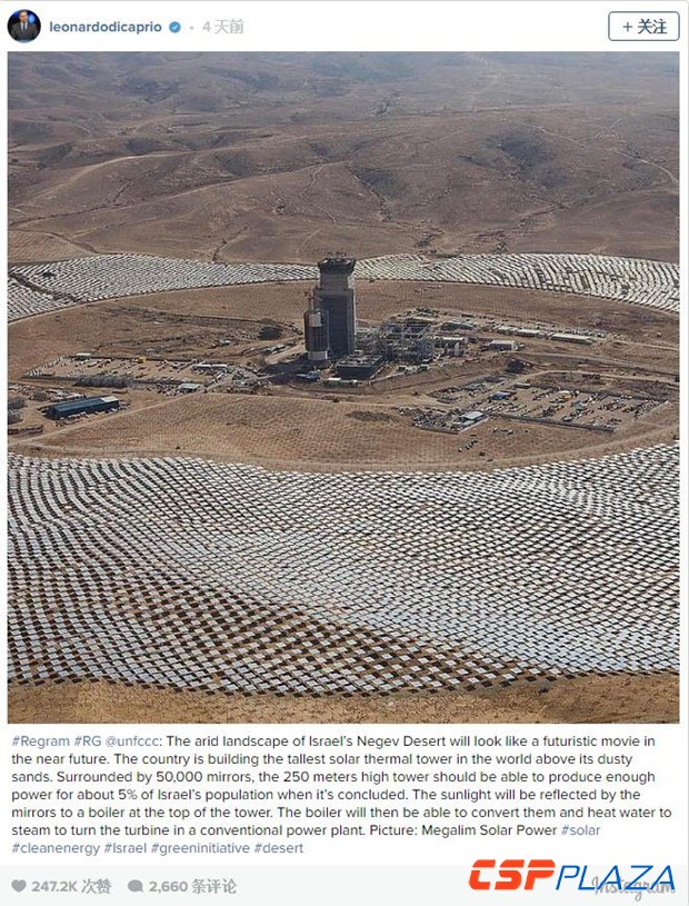 CSPPLAZA光熱發(fa)電網(wang)訊(xun):2017年1月19日,美國(guo)著(zhu)名(ming)影星(xing)萊昂納(na)多(duo)·迪卡普里奧(ao)在其社(she)交網站(zhan)Instagram上分享了一張以色列Ashalim1光熱(re)電站的圖片(pian)。Ashalim1光熱電站(zhan)目前正處于緊張的建設施工中,建成后有望成為全(quan)球最(zui)高的塔式(shi)光熱電站(zhan)。