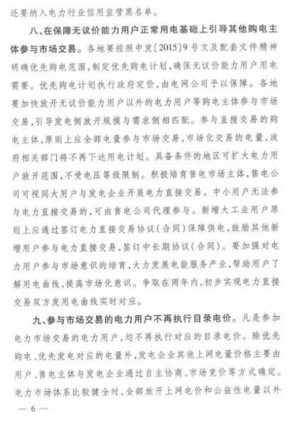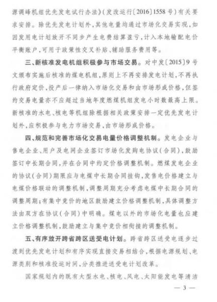 《國家發改委、國家能源局關于有序放開發用電計劃的通知》文件近日正式下發。該文件涉及的政策要點如下:加快發電企業與購電主體簽訂購電協議;逐年減少既有燃煤發電企業計劃用電量;原則上不再安排9號文件實施后核準的煤電機組;規范和完善市場化交易電量價格調整機制;有序開放跨省區送受電計劃;優先保障風電、太陽能、核電等新能源發電;參與市場交易的電力用戶不再執行目錄電價。