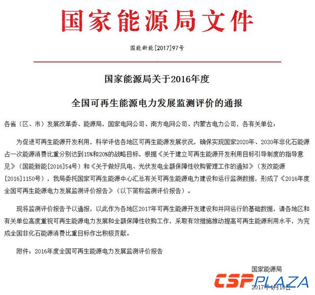 國家能源局關于2016年度全國可再生能源電力發展監測評價的通報