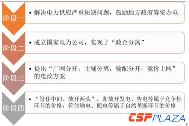 我國電力體制改革起步于1985年,主要經歷了四個階段。第一階段,解決電力供應嚴重短缺問題,鼓勵地方政府籌資辦電。第二階段,1996年《電力部機構改革方案》的出臺以及國家電力公司的成立實現了“政企分離”。第三階段,2002年國務院印發了“五號文”,提出“廠網分開,主輔分離,輸配分開,競價上網”的電改方案。第四階段,在售電側和發電側引入市場競爭機制,向社會資本放開配售電業務,放開輸配以外的競爭性環節電價,放開公益性和調節性以外的發電計劃,建立相對獨立的電力交易機構。