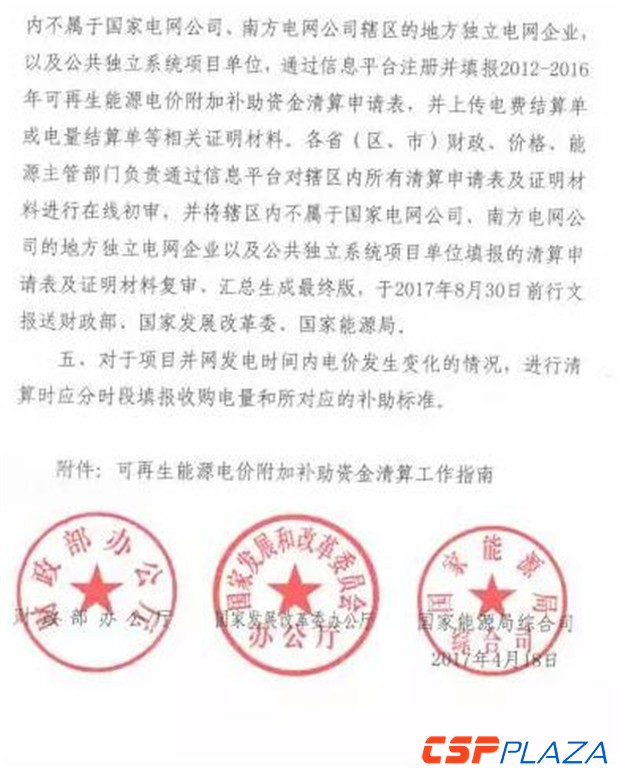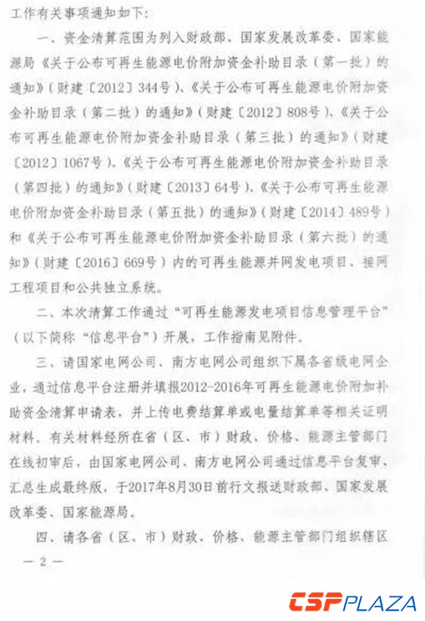 近日(ri),財政部、國家發(fa)改委(wei)、國家能源(yuan)(yuan)局聯合下發(fa)《關(guan)于開展可再生(sheng)能源(yuan)(yuan)電價(jia)附(fu)加補助資金清算工(gong)作的(de)(de)(de)通知》,對(dui)納入國家可再生(sheng)能源(yuan)(yuan)電價(jia)附(fu)加資金補貼(tie)第一批(pi)至(zhi)第六批(pi)目錄的(de)(de)(de)新能源(yuan)(yuan)補貼(tie)情況進行梳理,要求各單(dan)位(wei)(wei)8月30日(ri)前上報相關(guan)信(xin)息。據悉,該(gai)文的(de)(de)(de)發(fa)布對(dui)近年來可再生(sheng)能源(yuan)(yuan)拖欠的(de)(de)(de)補貼(tie)資金有望到位(wei)(wei)。