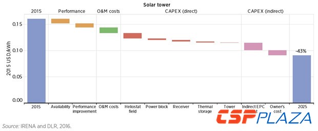 圖:塔式光熱電站2025年之前的成本下降曲線(數據來自IRENA2016年發布的報告)