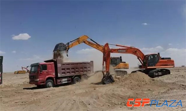 這幾天,阿克塞縣境內出現了高溫酷熱天氣,縣城境內最高氣溫達到38度以上,地面溫度達到了72.5度。在當金山南,甘肅光熱阿克塞四十里戈壁50兆瓦槽式高溫熔鹽光熱并網發電項目建設現場,中午時分的天氣異常干熱,刮起風來更是漫天塵土,悶熱難耐且能見度極低。7月11日中午,工人們吃過午飯稍作休息后,便趕往工地開始工作,大家在高海拔地區抗風沙、冒酷暑對挖掘機、貨車等進行保養檢修后,擼起袖子大干起來,數十臺挖掘機在建設場地間隆隆作響,將挖起的砂石料一斗一斗裝進車廂,裝滿砂石料的貨車來來往往,不停的將砂石料拉運到目的地。