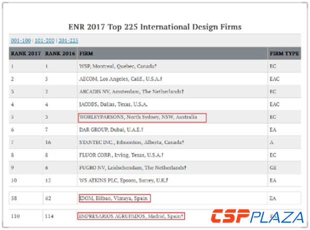 同樣關注中國光熱發電市場的海外工程設計企業中,西班牙IDOM排名從去年的62位上升到58位,而西班牙Empresarios Agrupados(EA)則從去年的114名上升至110名。