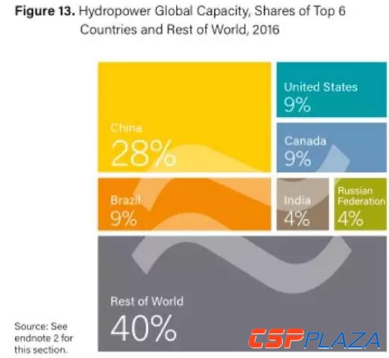 2016年全球水力發電裝機容量達到1096GW,水力發電裝機容量最多的國家是中國,占全球總量的28%,其次是巴西、美國、加拿大、俄羅斯和印度。中國歷年來都是水力發電量最多的國家,2016年達1162.8TWh,占全球總量的28.9%。
