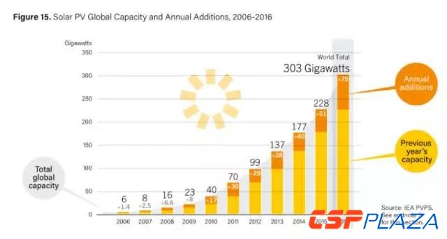 2016年光伏發電僅占全球總發電量的1.5%。根據《BP Statistical Review of World Energy June 2017》的報告,全球光伏發電總量為333.1TWh,年增長29.6%,其中中國占全球總量的19.9%,美國僅占第二位,為17.1%。