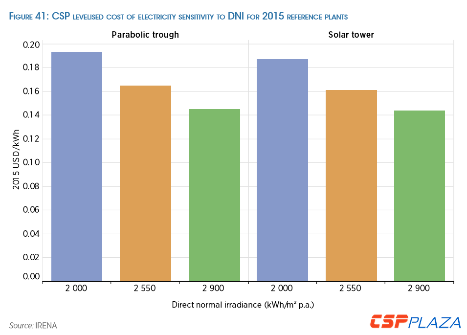 圖:CSP平(ping)準發電成本隨太(tai)陽直射常量(DNI)變化圖