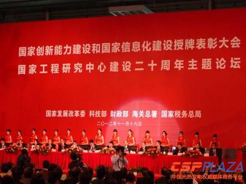 CSPPLAZA光熱發電網訊:據蘭州大成公司的消息,2012年11月16日下午,國家發展改革委在深圳隆重召開國家創新能力建設和國家信息化建設授牌表彰大會。國家發展改革委副主任張曉強、工業和信息化部副部長尚冰、中國科學院副院長施爾畏、深圳市市長許勤、中國信息協會會長盧時徹,原中國工程院副院長鄔賀銓院士、國家發展改革委副秘書長孟祥岳、國家知識產權局副局長賀化等領導出席大會,國務院有關部門、省市發展改革委和經信委(經貿委)、企事業單位代表和新聞媒體記者等800余人參加了授牌表彰大會。該公司董事長范多旺教授受邀參加授牌表彰大會。
