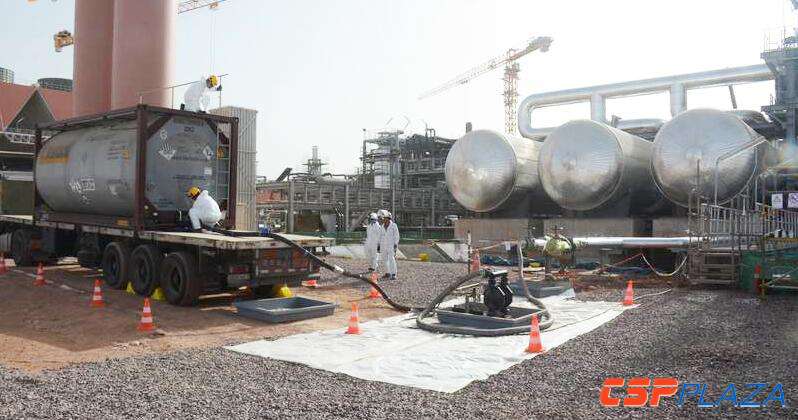 上午9點25分,專業技術人員經過一系列的注油前檢查,確認第一輛注油車接地良好,注油管道連接正常,注油車無異常泄露后,首次注油工作正式開始。注油過程中,各專業人員和調試人員認真進行巡檢,密切監控油溫和主油泵運行情況等,保證油溫正常和各個接口無泄漏。10點25分,第一車導熱油注油順利完成。整個注油過程的標準化作業流程和安全措施得到業主ACWA和聯合體合作方SENER領導的高度評價和認可。