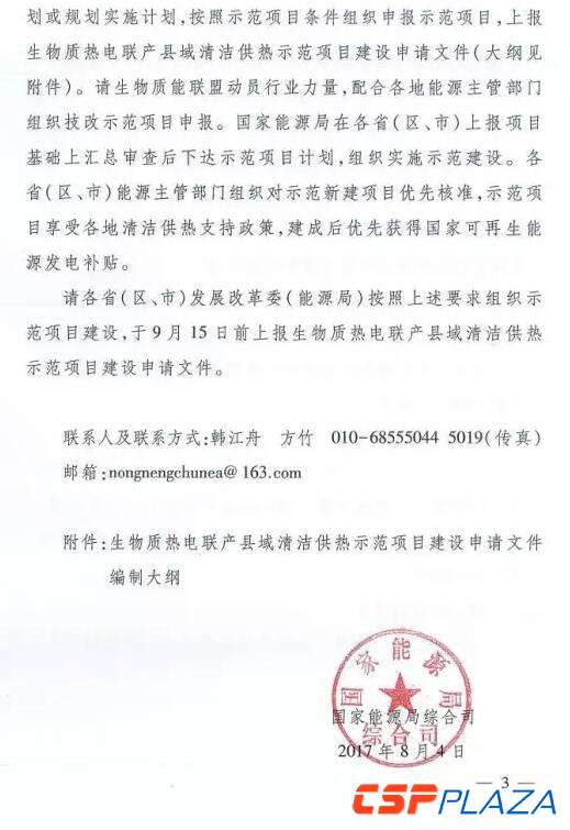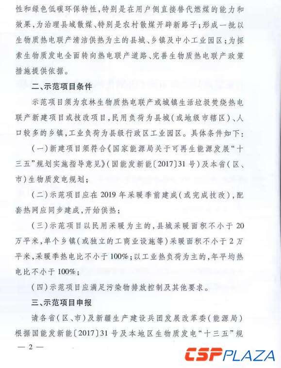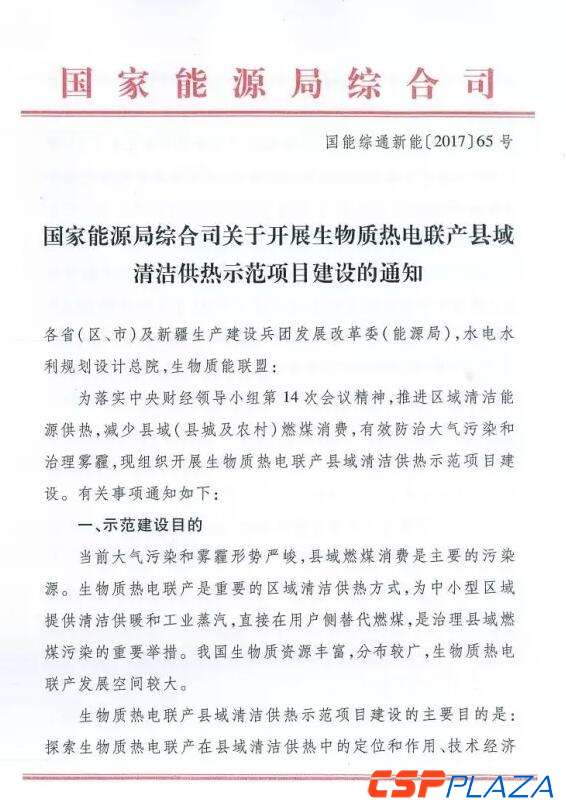 為落實中(zhong)央財經(jing)領導小組第14次會(hui)議精(jing)神,推(tui)進(jin)區域(yu)清潔(jie)能(neng)源(yuan)(yuan)供熱(re),減少(shao)縣域(yu)(縣城及(ji)農村)燃煤消(xiao)費(fei),有效防治大氣污染和治理霧霾,近日國家能(neng)源(yuan)(yuan)局正式發(fa)布(bu)《國家能(neng)源(yuan)(yuan)局綜合(he)司關于(yu)開展(zhan)生物質熱(re)電聯產(chan)縣域(yu)清潔(jie)供熱(re)示(shi)(shi)范(fan)(fan)(fan)項(xiang)目建設的通(tong)知》(國能(neng)綜通(tong)新(xin)(xin)能(neng)﹝2017﹞65號),要求(qiu)各省(區、市)發(fa)展(zhan)改革(ge)委(能(neng)源(yuan)(yuan)局)于(yu)9月15日前組織申報本(ben)省生物質熱(re)電聯產(chan)縣域(yu)清潔(jie)供熱(re)示(shi)(shi)范(fan)(fan)(fan)項(xiang)目,并對示(shi)(shi)范(fan)(fan)(fan)新(xin)(xin)建項(xiang)目優先核準,保障示(shi)(shi)范(fan)(fan)(fan)項(xiang)目享(xiang)受各地(di)清潔(jie)供熱(re)支(zhi)持政策,建成后(hou)優先獲(huo)得國家可再生能(neng)源(yuan)(yuan)發(fa)電補貼。