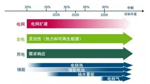 反觀另一個新能源發展大國德國,2016年可再生能源發電量占比已經超過了32%,在某些日子里可再生能源甚至能夠覆蓋約90%的電力消耗。在如此高的可再生能源比例下,整個電力系統的靈活性也亟待提高。根據德國聯邦環境部的分析,為了消納電網越來越多的波動性,需要提高以下四個領域的靈活性: