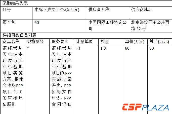 CSPPLAZA光熱發電網訊:8月22日,濱海光熱發電技術研發與產業化基地項目公布其實施方案、招標文件及PPP項目合同的審核評估服務中標公告。據公告顯示,該項目中標人為中國國際工程咨詢公司,中標金額為60萬元。