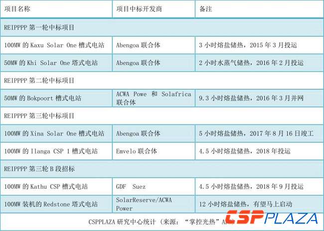 該國政府自數年前頒布可再生能源電力獨立生產采購計劃(REIPPPP)以來,一直在積極發展本國的可再生能源產業,其中涉及的光熱發電項目的最新進展如下表所示: