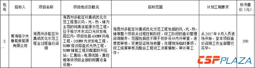 CSPPLAZA光熱發電網訊:近日(ri)(ri),魯(lu)能(neng)海西州多能(neng)互(hu)補集成優化示(shi)范工程(cheng)發(fa)布其全過(guo)程(cheng)造價咨詢招標(biao)公告。據(ju)公告顯示(shi),此(ci)次招標(biao)文(wen)件的獲取時(shi)間段為2017年9月(yue)1日(ri)(ri)至2017年9月(yue)7日(ri)(ri)(法定公休(xiu)日(ri)(ri)、法定節假日(ri)(ri)除外),每日(ri)(ri)上午(wu)9:00時(shi)至11:30,下午(wu)13:30至17:00時(shi)(北(bei)京時(shi)間),投標(biao)文(wen)件遞交的截止(zhi)時(shi)間與唱(chang)標(biao)時(shi)間均為2017年9月(yue)20日(ri)(ri)10:00。