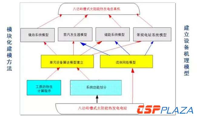 我們的仿真平臺是怎么做的呢?我以八達嶺1MW的槽式系統為例做說明,我們先根據電站的系統構成,先進行系統的劃分,在編寫所有的傳熱換熱工質物性計程序,在此基礎上,采用模塊化的建模方法,對每個設備,每個環節建立它的通用模型,再利用流體網絡把它連接結在一起,就構成主體模型。