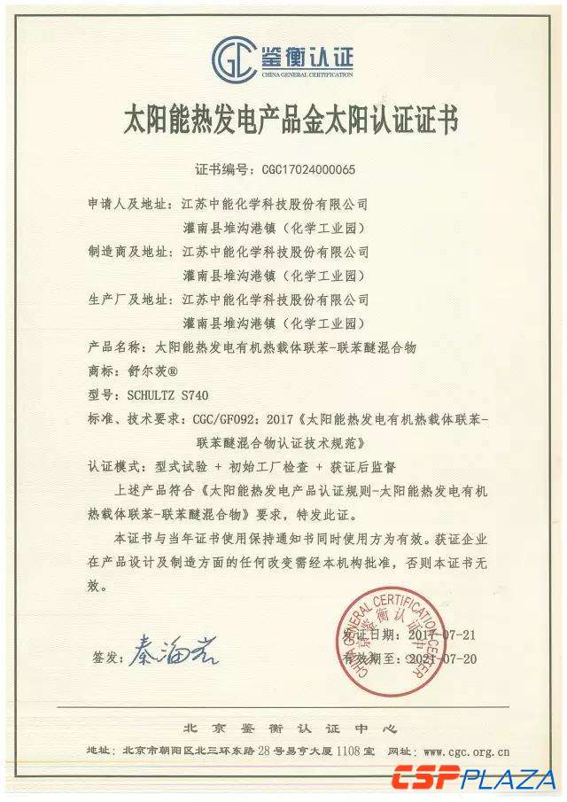 江蘇中能化學科技股份有限公司正是依據該技術規范對其太陽能熱發電有機熱載體聯苯—聯苯醚混合物產品進行了嚴格測試。此外,此次認證還對中能科技生產廠進行了工廠檢查,包括對企業設計開發、材料采購、工藝策劃、生產制造、檢驗試驗、包裝貯存、售后服務等各個環節進行了審核,以確保企業的獲證產品可以持續滿足鑒衡金太陽認證要求。