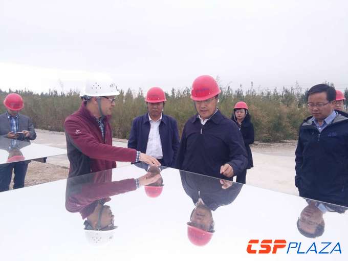 熊步青陪同張濤副院長一行10余人參觀了一期工程電站鏡場、電站主控室及汽輪機平臺,介紹了公司詳細發展情況、光熱儲能電站的工藝流程、聚光、吸熱、儲熱等關鍵核心技術和創新亮點、光熱產業的未來發展方向以及在建50MW工程建設情況,并與張濤副院長就太陽能熱發電的技術特點以及未來成本下降空間等話題進行了深入的探討。