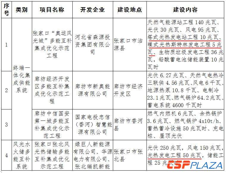 CSPPLAZA光熱發電網訊:日前,河北省發展和改革委員發布了名為《關于做好多能互補集成優化示范工程工作的通知》(以下簡稱“通知”),共涉及4個項目,其中包含光熱發電項目的有“張家口‘奧運風光城’多能互補集成優化示范工程”和“張家口張北風光熱儲輸多能互補集成優化示范工程”,光熱項目總裝機為65MW。