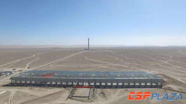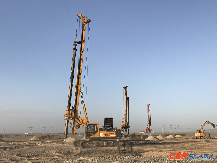 作為首批光熱發電示范項目的建設基地之一,該電站有全球單機最大的聚光集熱鏡場,共一萬余臺定日鏡。截止目前,已完成定日鏡基礎8000多個,定日鏡立柱開始安裝,且定日鏡組裝車間完成封頂。