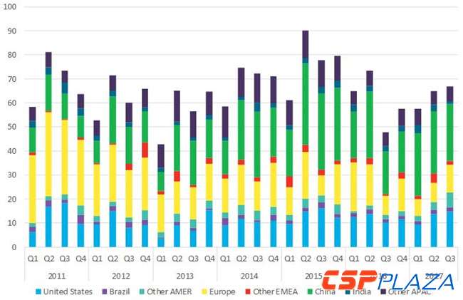 按照投資類型劃分,2017年第三季度公用事業規模可再生能源項目資產融資比上年同期增長72%,達543億美元。小規模項目投資(太陽能系統裝機容量小于1MW)達到108億美元,同比增長9%。