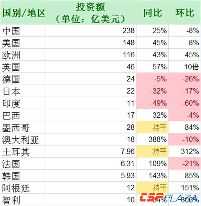 將投資(資產融資,小型項目,風險投資/私募股權,公開市場和再投資權益調整)等所有類別綜合起來,按國別來看,第三季度投資包括: