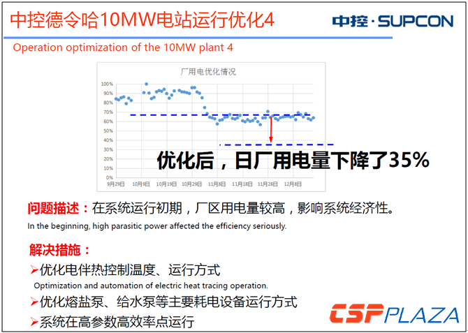 浙江中控太陽能技術有限公司(簡稱中控)董事長金建祥就曾在CSPPLAZA舉辦的CPC2017以及會員單位巡回調研等活動中多次提及廠用電的優化。金建祥表示,降低廠用電是提升效益的有效手段。中控德令哈10MW熔鹽塔式光熱發電項目在運行初期廠用電偏高,對系統經濟性提出了很大的挑戰。經過一段時間的總結與摸索之后,中控對此采取了一系列解決措施:優化電伴熱控制溫度及運行方式;優化熔鹽泵、給水泵等主要耗電設備運行方式;選擇在系統高參數效率點運行等。實踐表明,在進行一系列優化后,電站日廠用電率下降幅度可觀,降幅達到35%。