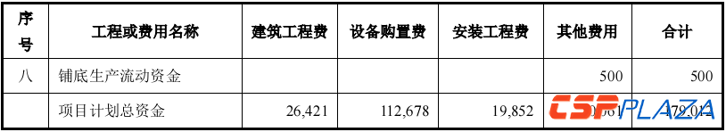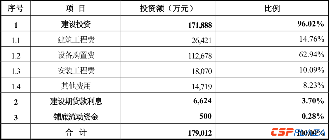 回復中顯示,本次募投項目總投資為179,012萬元,其中建設投資171,888萬元,建設期貸款利息6,624萬元,鋪底流動資金500萬元。