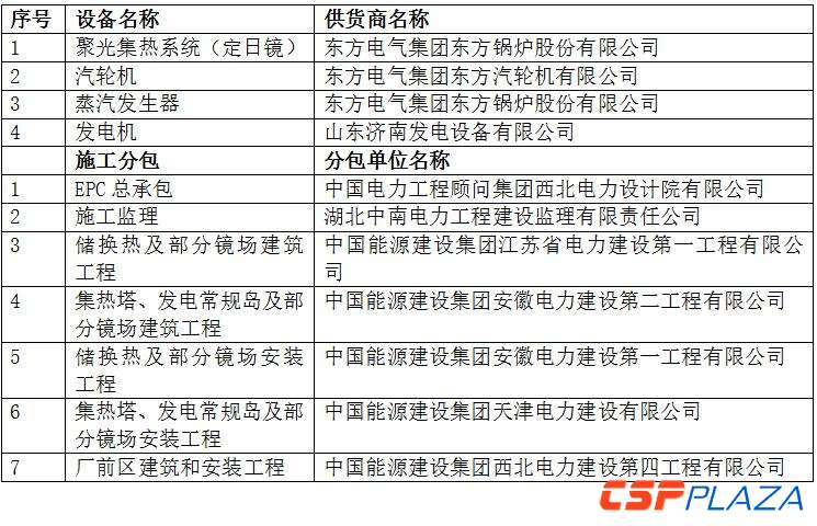 據(ju)CSPPLAZA此前報道,截至目(mu)前,該(gai)項(xiang)目(mu)已完(wan)成EPC總承包、三(san)大主(zhu)機設(she)備(bei)、聚(ju)光集(ji)熱系統及(ji)施工(gong)(gong)分包等(deng)招標工(gong)(gong)作,并于9月(yue)20日(ri)至21日(ri)順利通過(guo)初(chu)步設(she)計審(shen)查,項(xiang)目(mu)實際主(zhu)要建(jian)設(she)方及(ji)主(zhu)要設(she)備(bei)提(ti)供方如下: