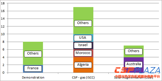 光熱發電技術的上述獨特應用市場正引起工業各界對其越來越大的興趣,在全球已經開始應用光熱發電技術的國家中,高達76%數量的國家都有上述光熱發電技術的應用型項目出現,在這些國家中,又有48%的國家開發的光熱電站項目有將近50%的項目為混合型或非常規光熱電站。