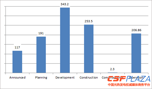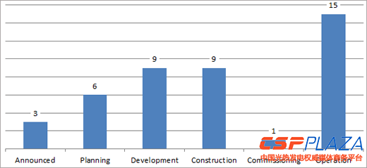 一個光熱發電項目從項目規劃開始到實際運行,一般需要2~4年的時間,上述43個項目并非全部建設完成,其所處的的開發階段分布如下(見圖表5):