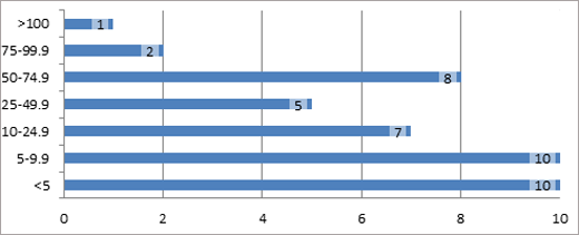 非常規光熱發電(dian)項目的(de)應用多為小規模項目,平均的裝機規模小于26MWe,圖表(biao)10將分布于各個裝機范圍內的相關項目進行了分類。其中在50MW以上的有11個。