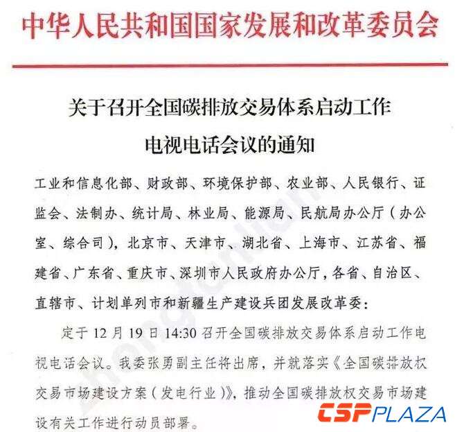 12月14日,國家發改委發布《關于召開全國碳排放交易體系啟動工作電視電話會議的通知》(簡稱“通知”)。