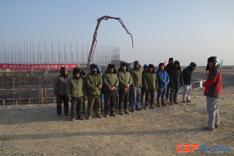 該項目于12月10日開始吸熱塔基礎澆筑,各方不畏嚴寒、精心施工,歷時58小時,順利完成澆筑作業,彼時哈密最低氣溫已低至零下14℃左右,工人們要穿著厚厚的防寒服才能抵御寒冷,但項目現場依然是一番熱火朝天的施工景象,經過了前期緊張、認真的籌備以及相關保障措施的落實,保證了工程在高寒條件下的施工進度與施工質量。