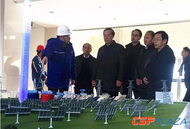 于叢樂秘書長一行近20余人先行來到公司辦公樓大廳,了解了公司的基本情況,隨后參觀了一期工程10MW電站的鏡場。參觀過程中,熊步青向于叢樂秘書長詳細介紹了公司發展情況、光熱儲能電站的工藝流程、聚光、吸熱、儲熱等關鍵核心技術、創新亮點、光熱產業的未來發展方向以及在建50MW工程建設情況。于叢樂秘書長在聽取介紹后表示國家一直以來大力支持清潔能源及特色產業的發展,中控太陽能光熱發電項目是國家級清潔能源示范點,通過新能源項目帶動相關產業發展,更多的為國家能源結構調整做出貢獻,同時突出產業優勢、實現經濟增長,做到企業科技創新,技術轉變。企業要遵循“創新、協調、綠色、開放、共享”的發展理念,聯合資源開發,形成“發、輸、儲、配”產業鏈,延長新能源產業體系。
