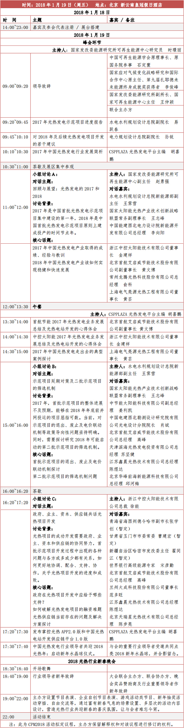CSPPLAZA光熱發電網訊:1月19日,由CSPPLAZA主辦、常州龍騰光熱科技股份有限公司聯合協辦的2018中國光熱發電產業回顧與展望領導者峰會暨CSPPLAZA2018新年匯(CPM2018)將在北京新云南皇冠假日酒店盛大召開。
