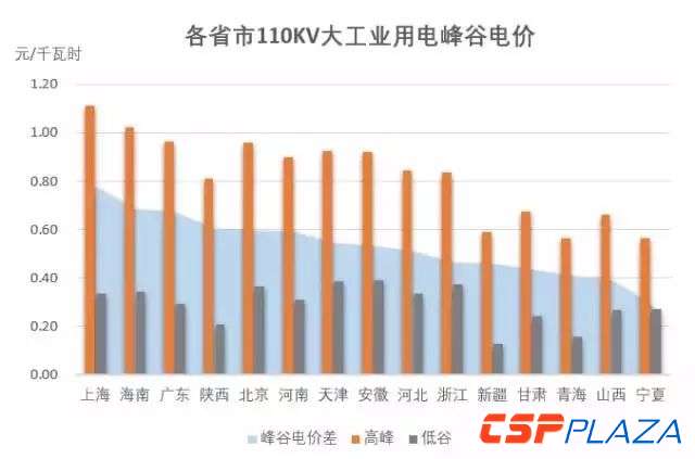 2017年不少企業進行了商業模式的探索,儲能商業項目應用最多的是峰谷電價差套利,根據CNESA儲能項目庫對中國儲能項目的追蹤統計,江蘇、北京、廣東成為2017年國內儲能項目規劃建設投運最熱門地區,這些地區經濟發達,工商業園區多,用電負荷大,用戶側峰谷電價差較大,擁有較大的套利空間。根據2017年8月公布的各省市大工業用電峰谷電價,多地峰谷電價差大于0.6元/千瓦時。