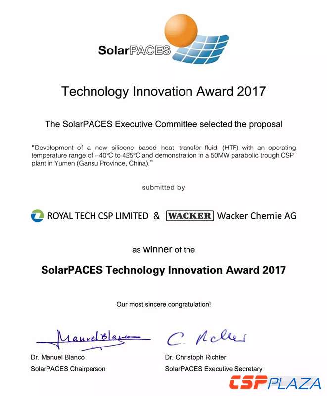2017年9月29日,常州龍騰光熱科技股份有限公司與德國瓦克化學股份有限公司憑借新型硅油的優異性能及將在商業化項目上的全球首次大規模應用聯手斬獲SolarPACES2017技術創新獎,實現了亞洲光熱企業在此項殊榮上零的突破。