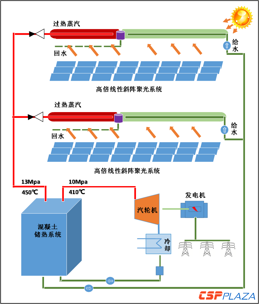 ▌大(da)規模(mo)混凝(ning)土固態(tai)儲熱系統(tong),進(jin)一(yi)步平滑穩定(ding)蒸(zheng)汽(qi)參數(shu)。鏡場聚光集熱產生(sheng)(sheng)的(de)(de)蒸(zheng)汽(qi)既可以(yi)在晴朗(lang)天氣時(shi)段,由(you)(you)旁(pang)路(lu)分出部(bu)分汽(qi)量直推(tui)汽(qi)輪機(ji),也可以(yi)把較復(fu)雜光照(zhao)時(shi)段或參數(shu)不夠穩定(ding)的(de)(de)蒸(zheng)汽(qi)全部(bu)送往大(da)規模(mo)混凝(ning)土固態(tai)儲熱系統(tong)進(jin)行分類(lei)儲存,汽(qi)輪機(ji)則可以(yi)由(you)(you)儲熱系統(tong)輸出單元產生(sheng)(sheng)的(de)(de)參數(shu)穩定(ding)的(de)(de)蒸(zheng)汽(qi)進(jin)行推(tui)動,這是實現充分利用各類(lei)光照(zhao)資源、確保持續穩定(ding)發電輸出的(de)(de)系統(tong)性(xing)關鍵環節。